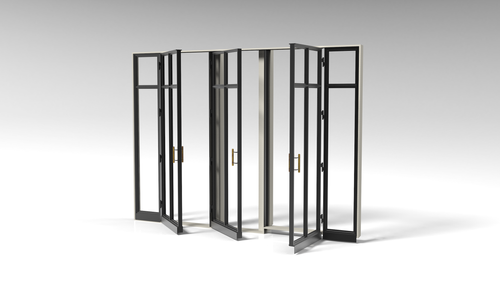 This project included three sets of custom shower doors, including an entire wall of made up of three doors and two sidelights for the master bath. The transom door design is made up of three layers of stainless steel bar and angle iron with turned brass handles. The doors were made to precise specifications for a private residence on Martha’s Vineyard.